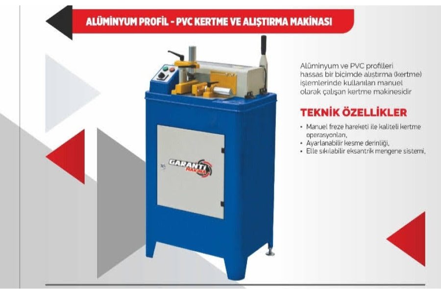 Garanti makine olarak Alüminyum Profil-PVC Kertme ve alıştırma makinesi imalatımız vardır. Toptan ve perakende satışlarımız mevcuttur.
