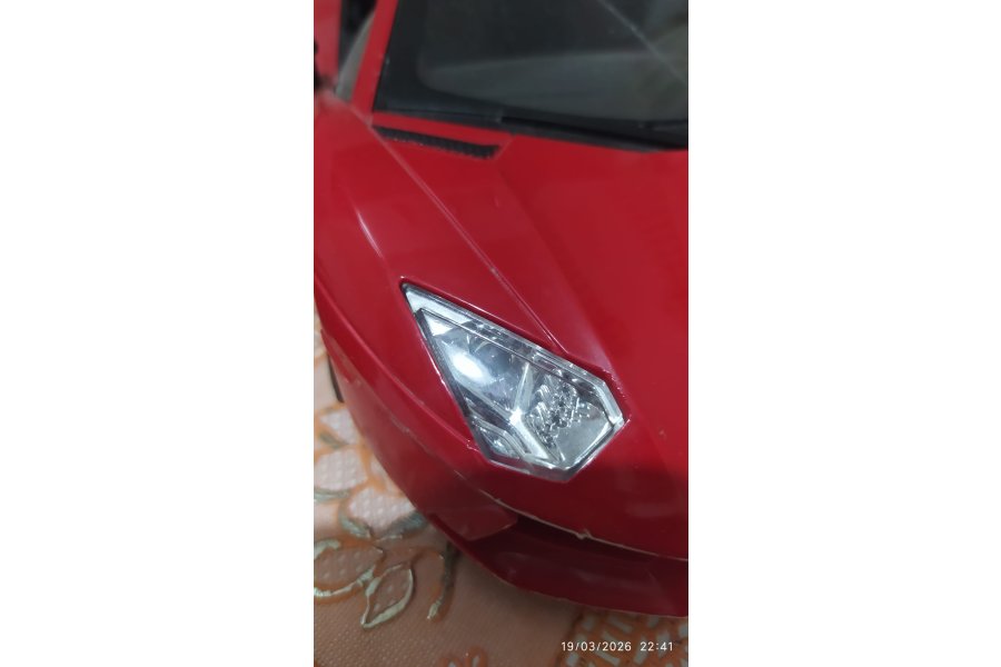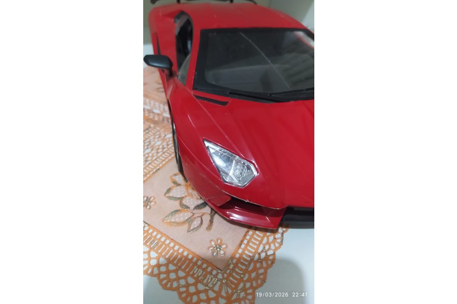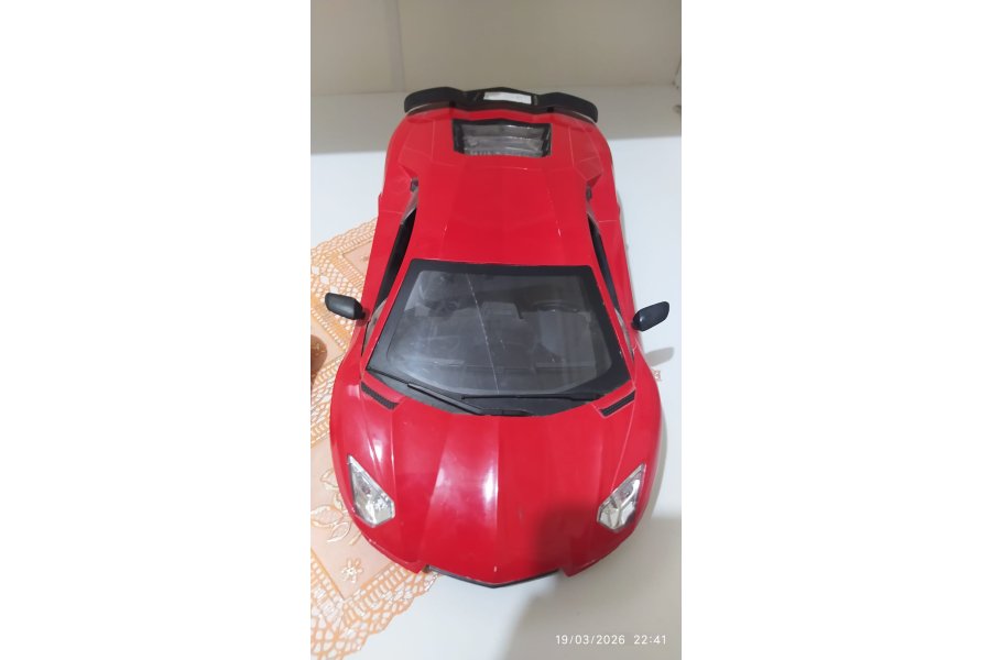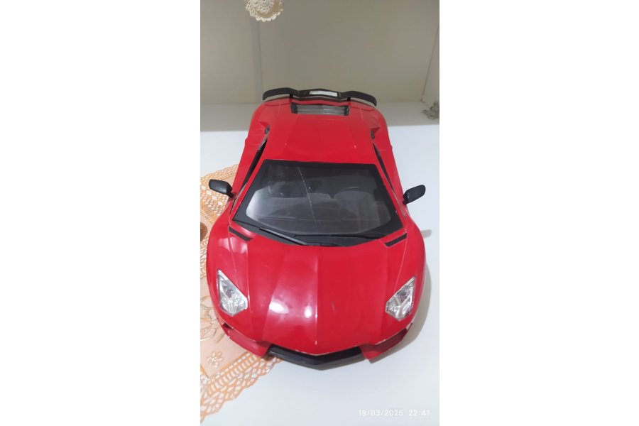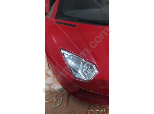 Tam bir Lamborghini Aventador replikası! Parlak kırmızı renk, büyük arka spoiler, detaylı ön farlar, yan aynalar ve gerçekçi spor tasarım ile çok şık duruyor.